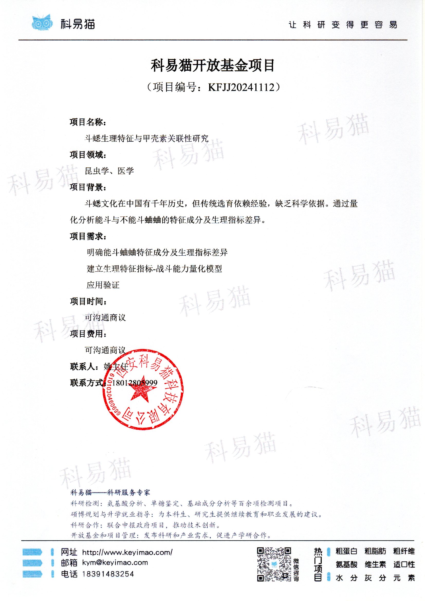 科易猫关于“斗蟋生理特征与甲壳素关联性研究”开放基金项目KFJJ20241112