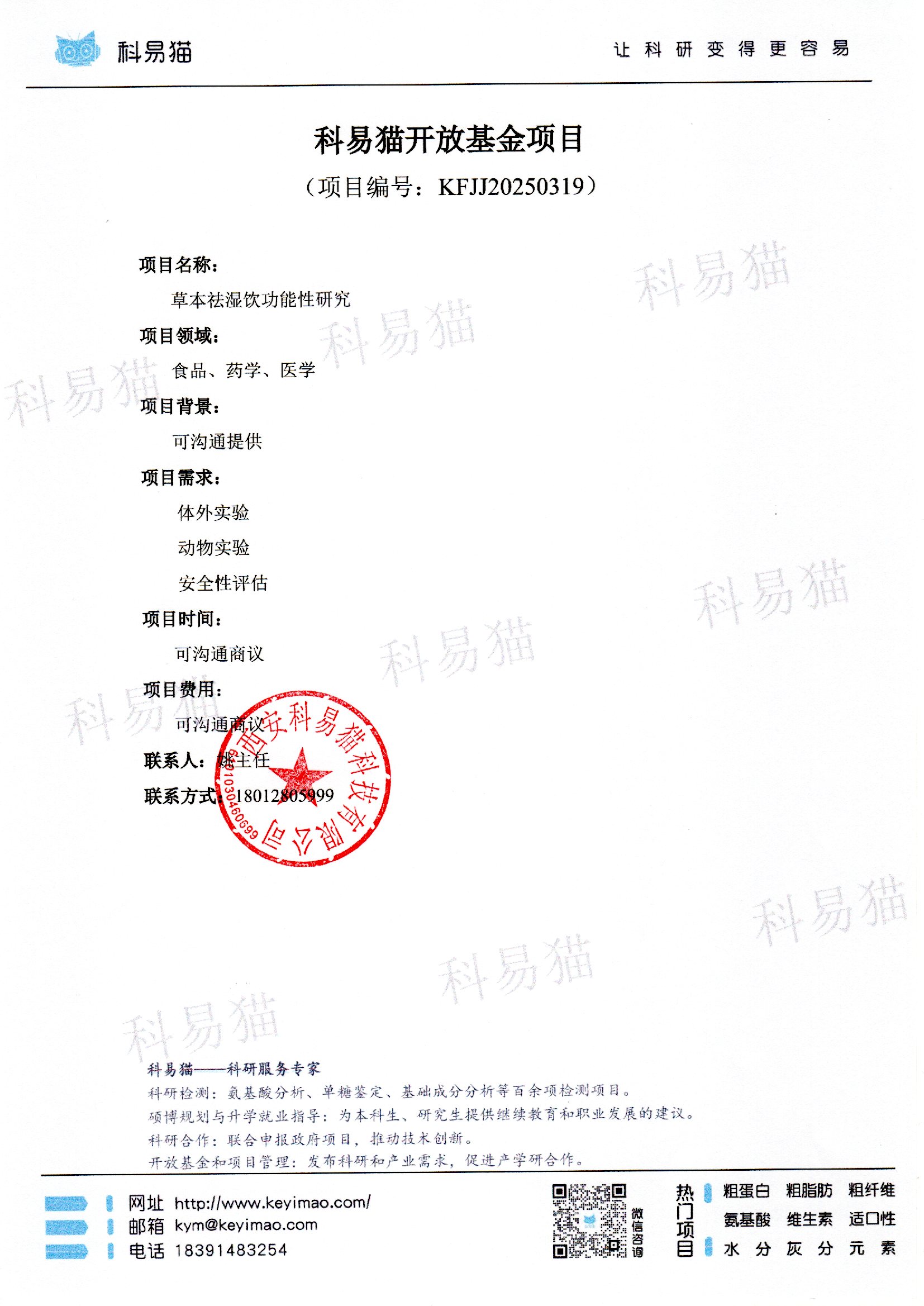 科易猫关于“草本祛湿饮功能性研究”开放基金项目KFJJ20250319
