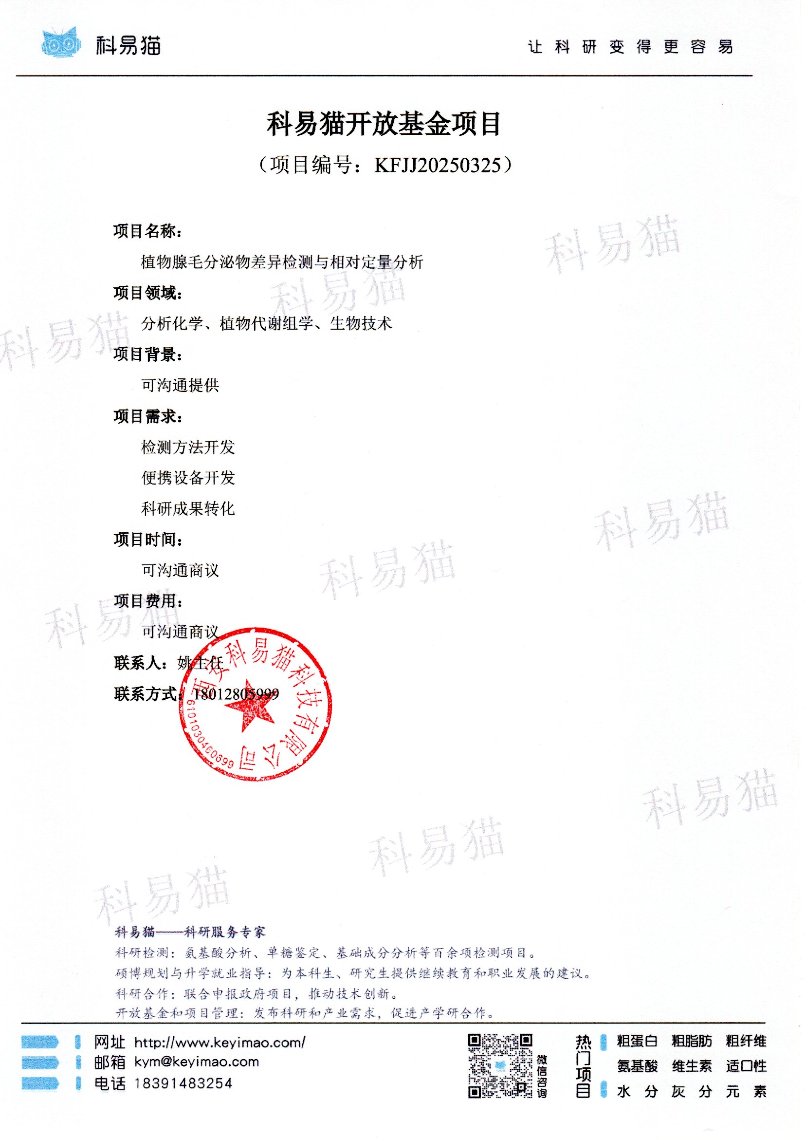 科易猫关于“植物腺毛分泌物差异检测与相对定量分析”开放基金项目KFJJ20250325