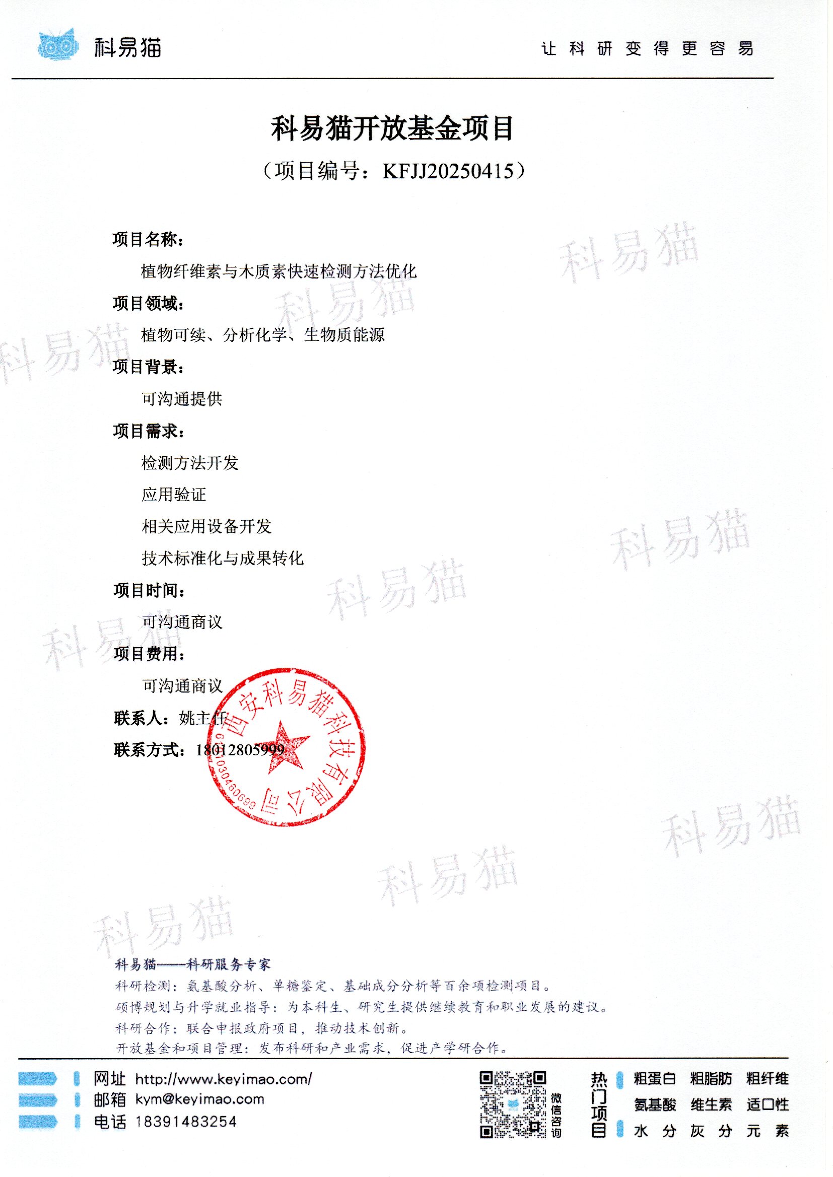 科易猫关于“植物纤维素与木质素快速检测方法优化”开放基金项目KFJJ20250415