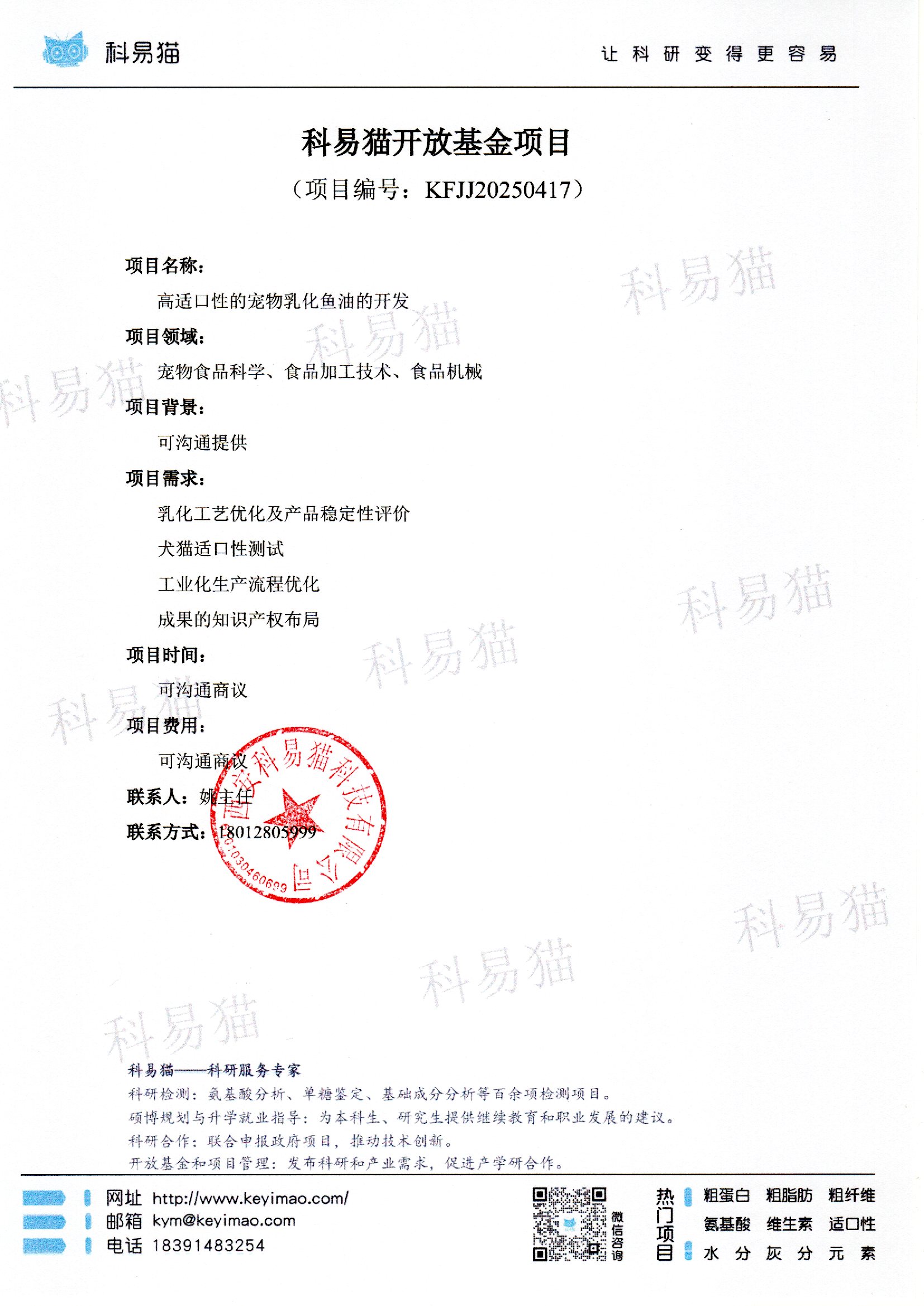 科易猫关于“高适口性的宠物乳化鱼油的开发”开放基金项目KFJJ20250417