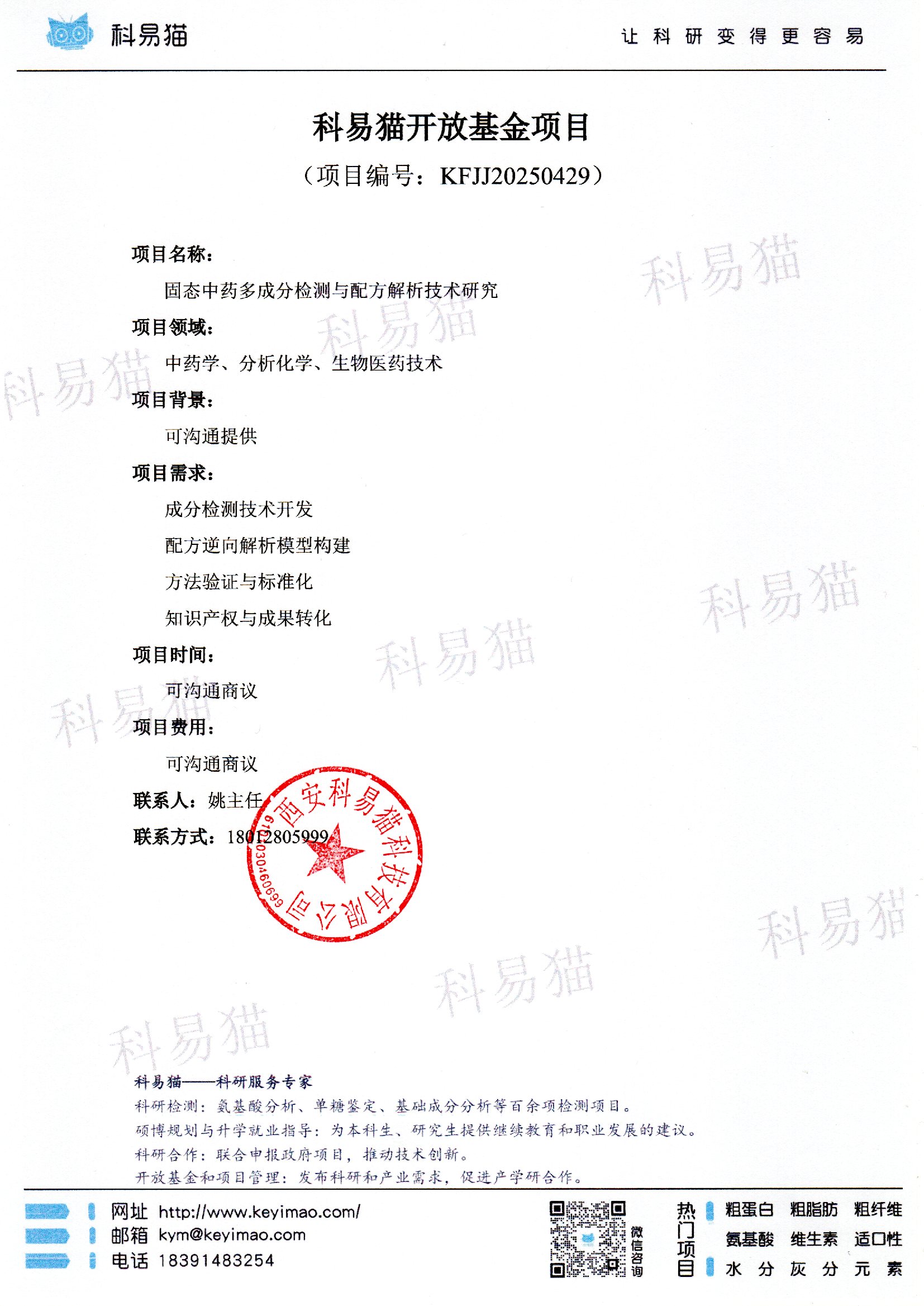 项目名称: 固态中药多成分检测与配方解析技术研究 项目领域: 中药学、分析化学、生物医药技术 项目背景: 可沟通提供 项目需求: 成分检测技术开发 配方逆向解析模型构建 方法验证与标准化 知识产权与成果转化 项目时间: 可沟通商议 项目费用: 可沟通商议 联系人:姚主任 联系方式:18012805999
