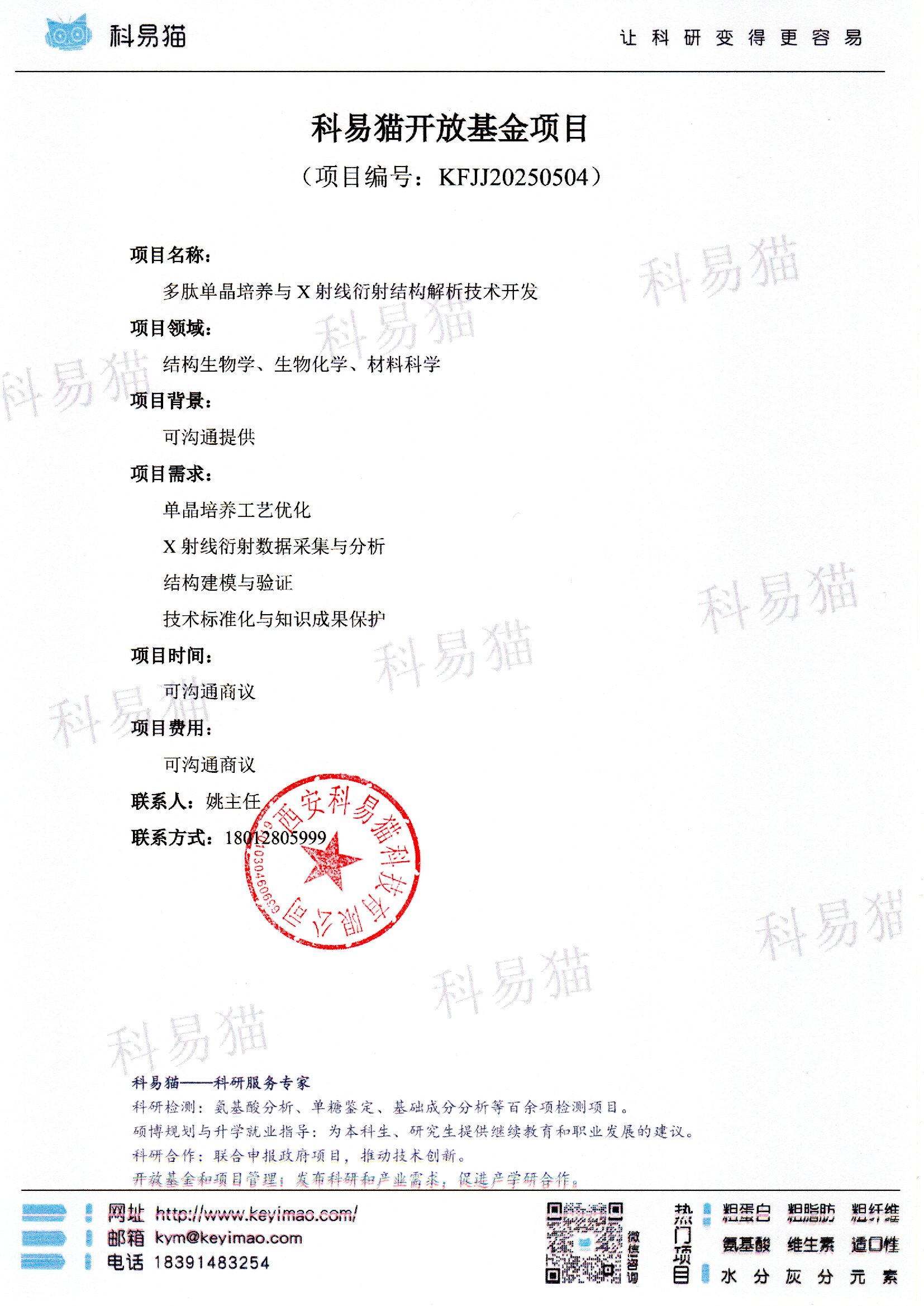 项目名称: 多肽单晶培养与X射线衍射结构解析技术开发 项目领域: 结构生物学、生物化学、材料科学 项目背景: 可沟通提供 项目需求: 单晶培养工艺优化 X射线衍射数据采集与分析 结构建模与验证 技术标准化与知识成果保护 项目时间: 可沟通商议 项目费用: 可沟通商议 联系人:姚主任 联系方式:18012805999