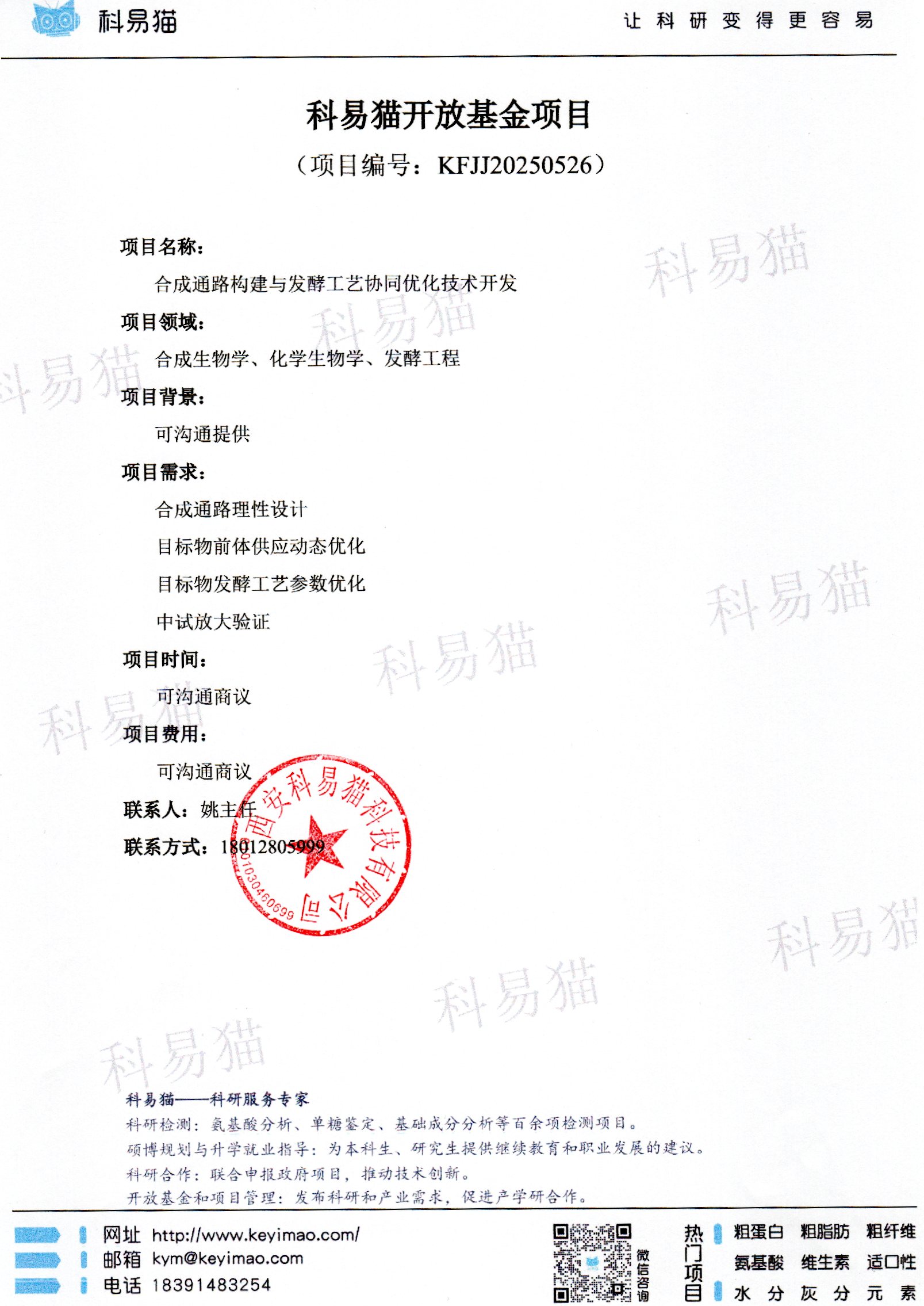 项目名称: 合成通路构建与发酵工艺协同优化技术开发 项目领域: 合成生物学、化学生物学、发酵工程 项目背景: 可沟通提供 项目需求: 合成通路理性设计 目标物前体供应动态优化 目标物发酵工艺参数优化 中试放大验证 项目时间: 可沟通商议 项目费用: 可沟通商议 联系人:姚主任 联系方式:18012805999