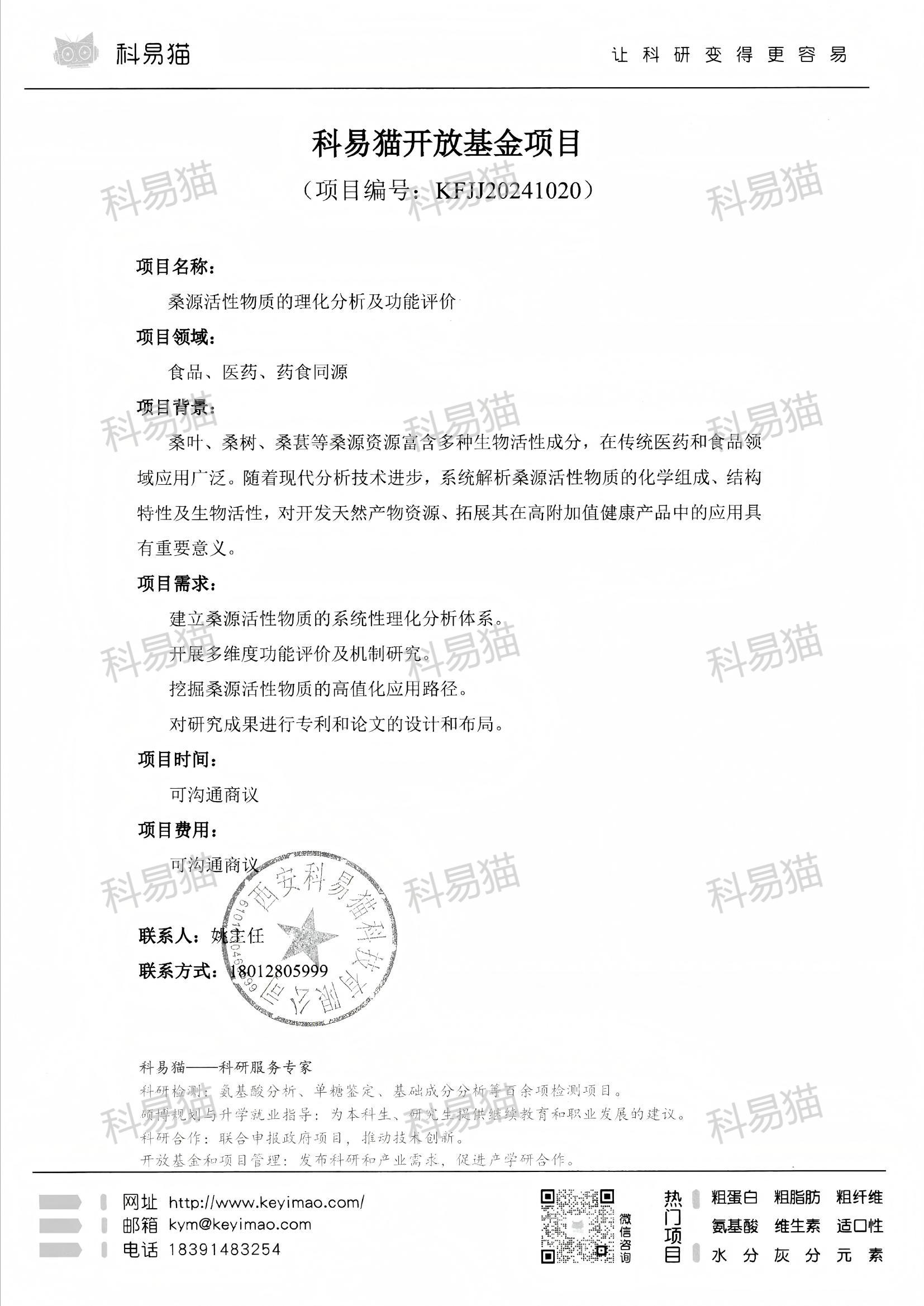 科易猫关于“桑源活性物质的理化分析及功能评价”开放基金项目KFJJ20241020
