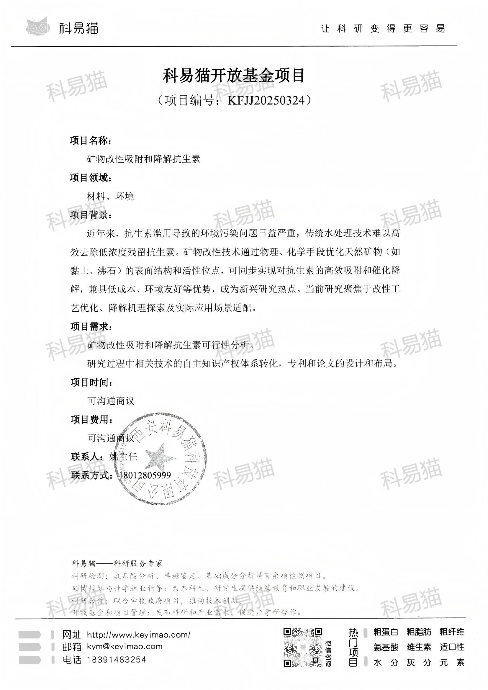 科易猫关于“矿物改性吸附和降解抗生素”开放基金项目KFJJ20250324
