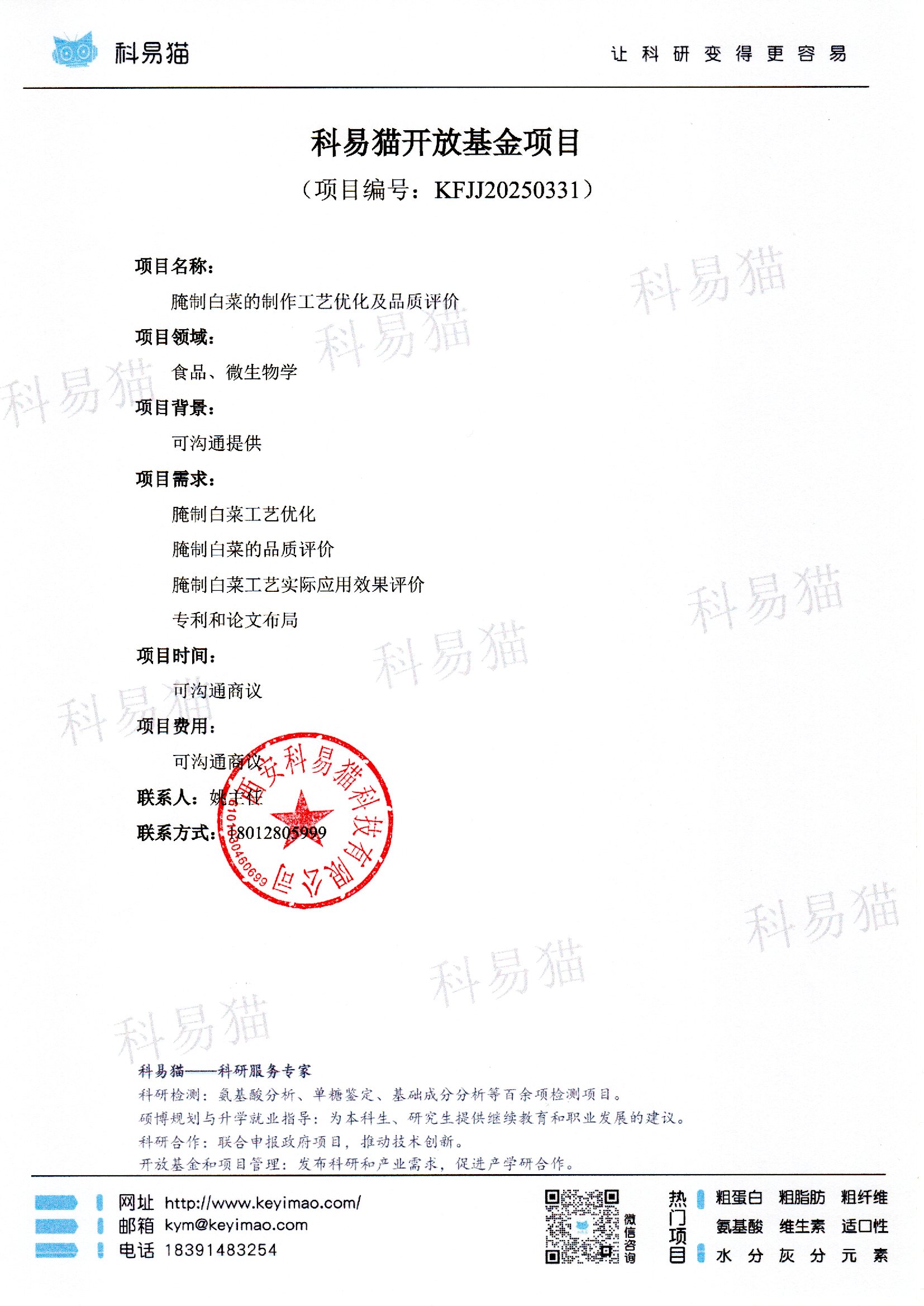 科易猫关于“腌制白菜的制作工艺优化及品质评价”开放基金项目KFJJ20250331