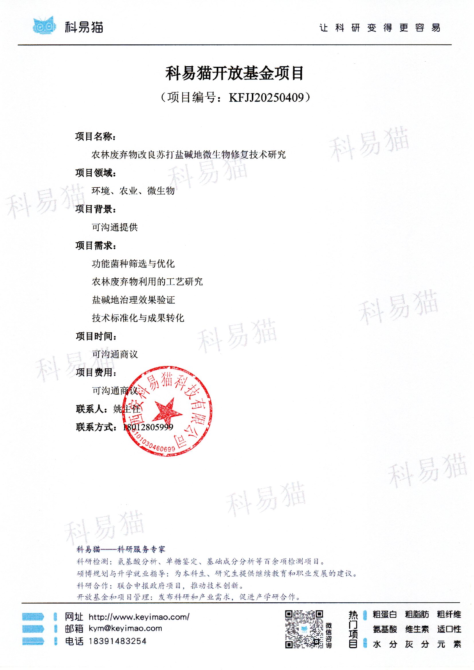 科易猫关于“农林废弃物改良苏打盐碱地微生物修复技术研究”开放基金项目KFJJ20250409