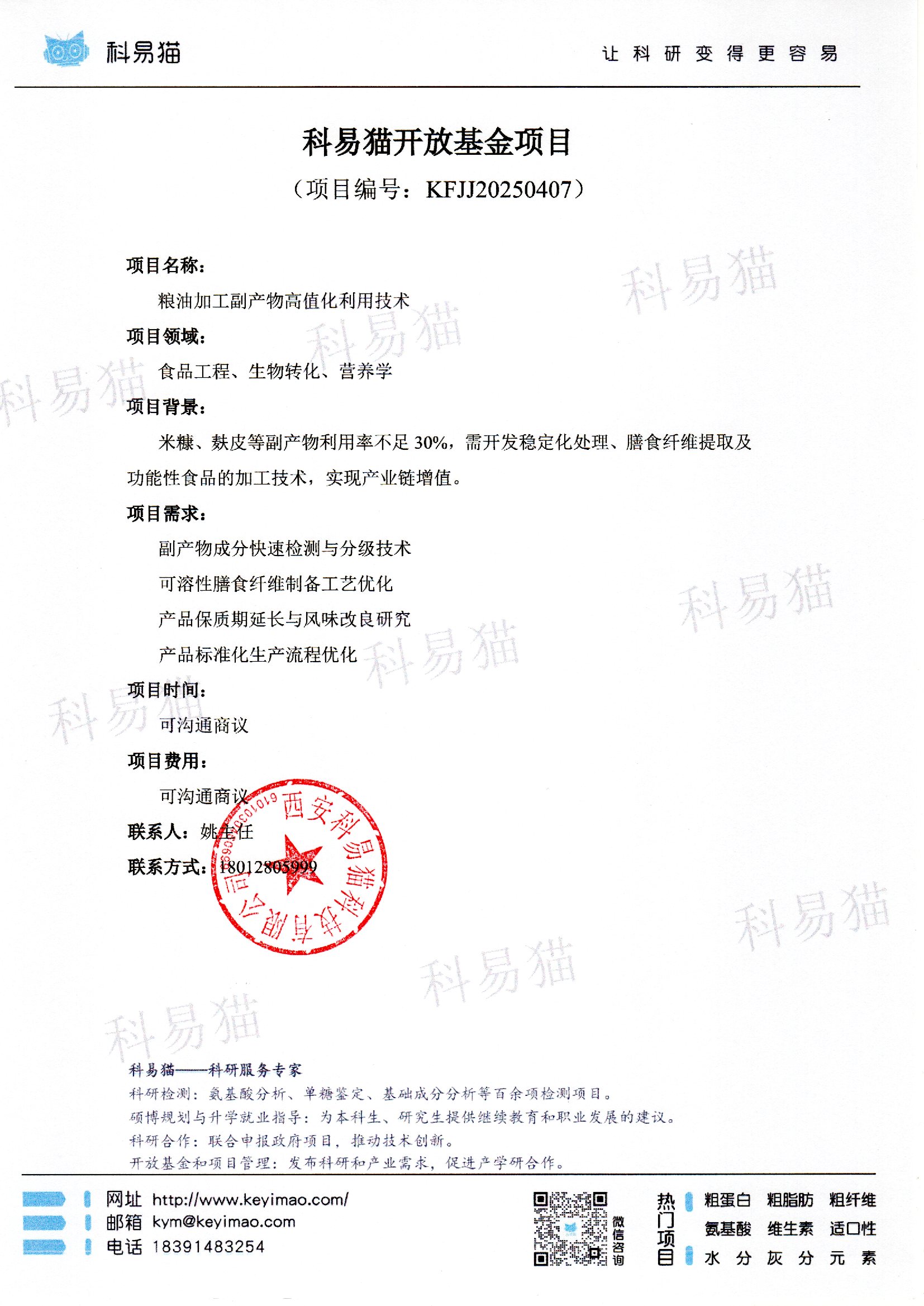 科易猫关于“粮油加工副产物高值化利用技术”开放基金项目KFJJ20250407