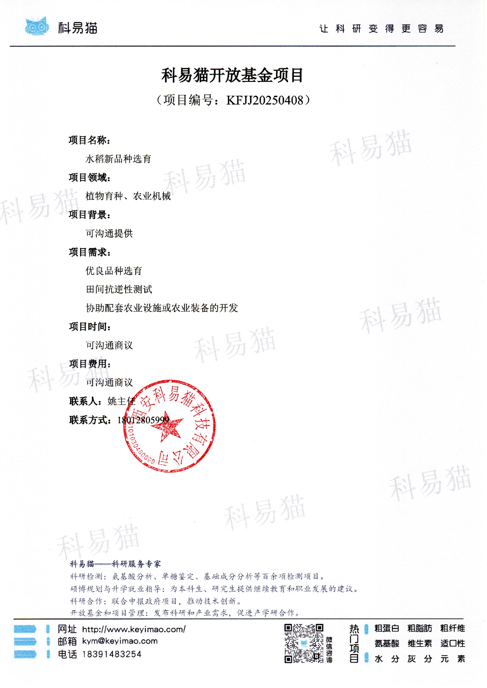 科易猫关于“水稻新品种选育”开放基金项目KFJJ20250408