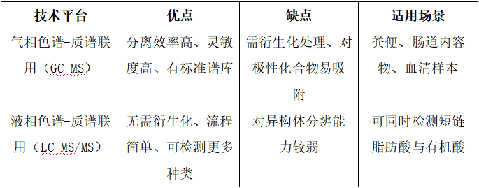目前主流仍是GC-MS平台。GC-MS具有高分离效率、高灵敏度(可检测pg级别)以及强大的定性能力——通过质谱图中的碎片离子信息与标准数据库比对,可准确鉴定短链脂肪酸的化学结构。