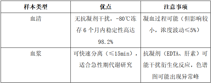 建议:对于长期的研究,优先选择血清;对于急性代谢研究,可选择血浆但需注意抗凝剂影响。